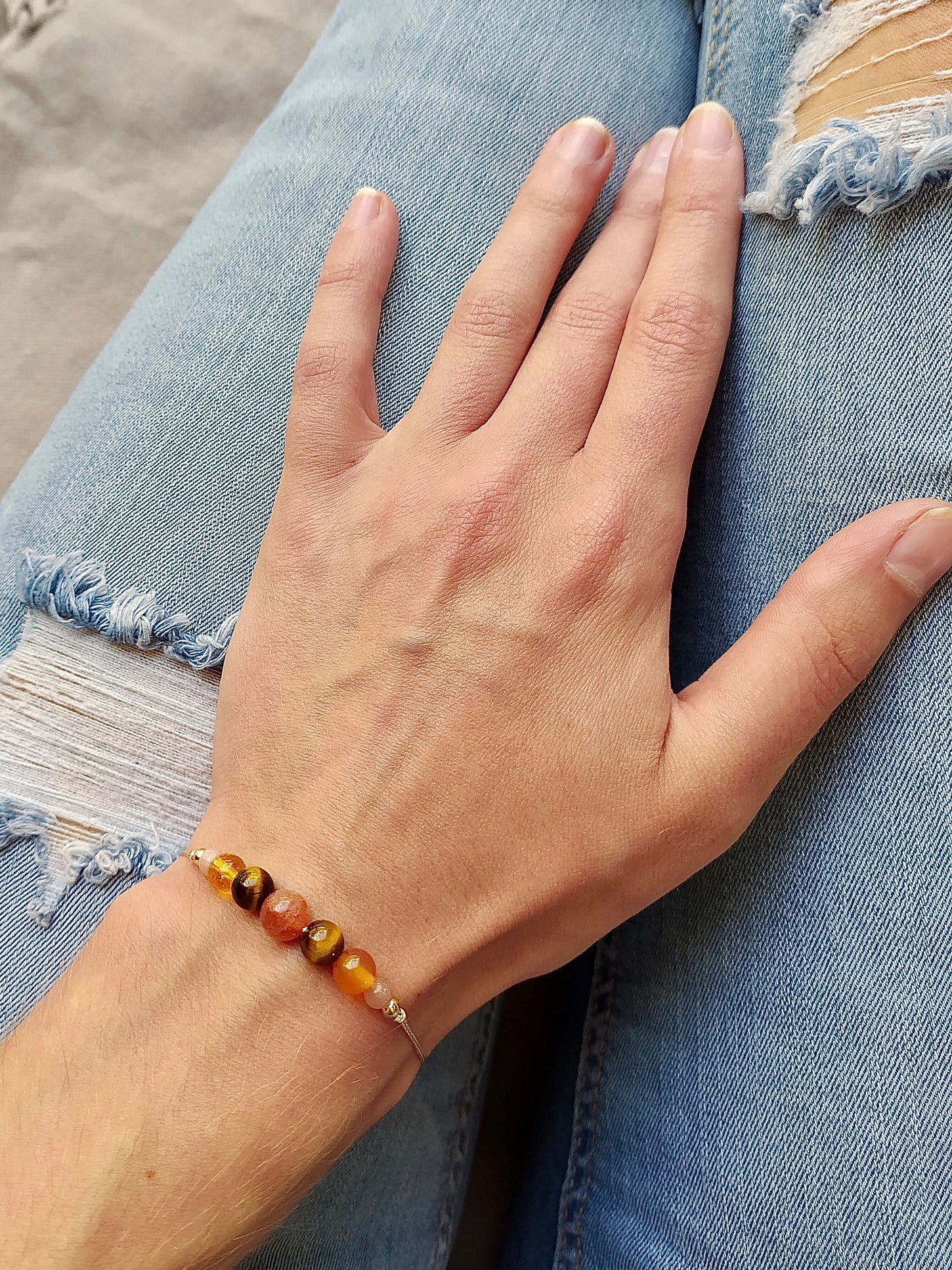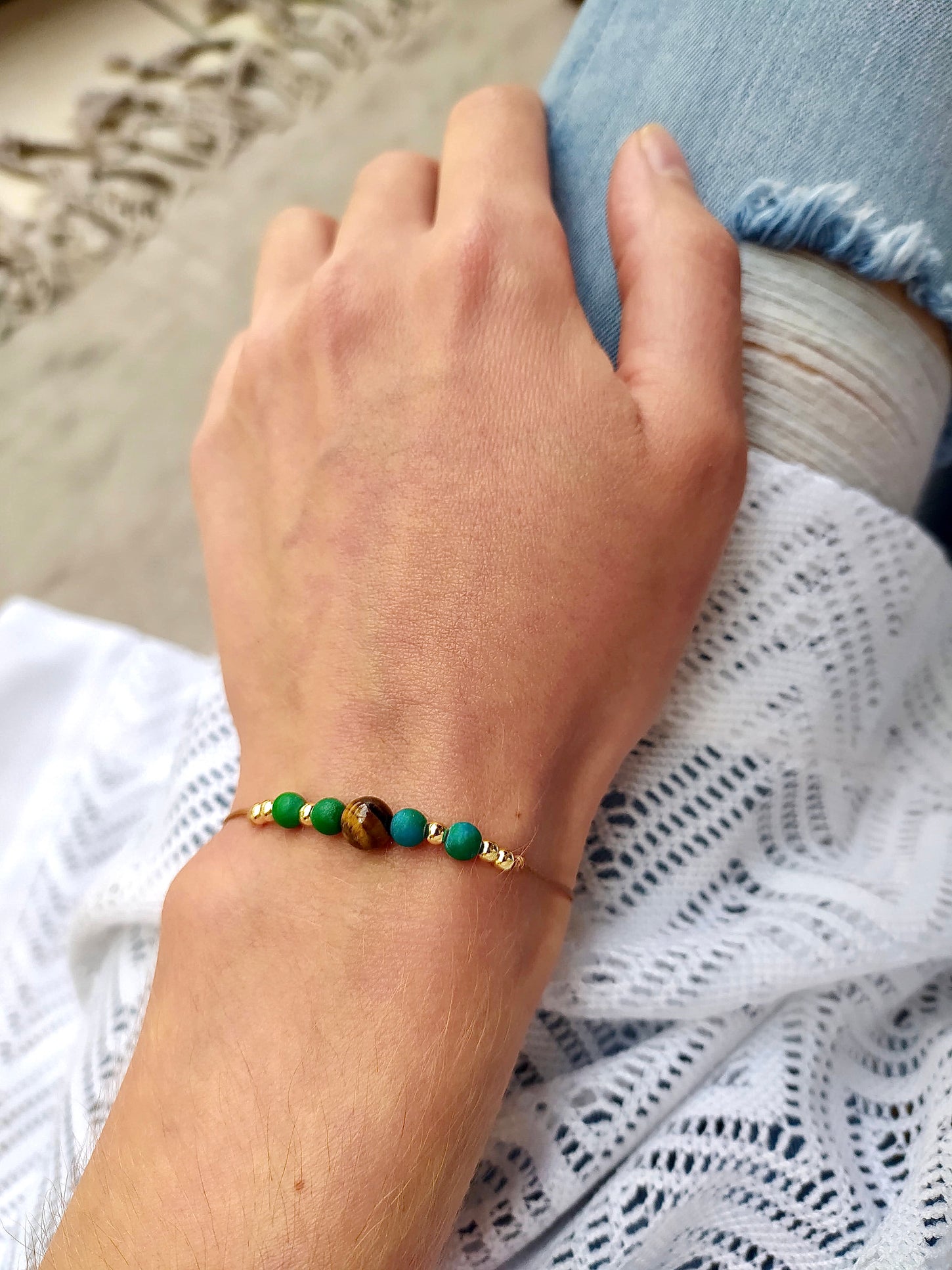 Chaque bracelet est entièrement fabriqué à la main avec des pierres fines naturelles et non teintées que nous sélectionnons en fonction des vertus qui leur sont propres. Nous utilisons un fil en coton ciré connu pour sa résistance à l’eau et dans le temps.